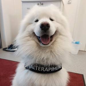 Jag är Yeti, en samojedhund. Jag har arbetat som talterapihund sedan hösten 2021. Jag tycker om att följa med matte på terapi, och tycker speciellt mycket om att använda mig av lyckohjulet under terapin. Jag tycker om alla människor, och viftar glatt på svansen när jag hälsar. Jag anpassar mitt sätt efter vem jag jobbar med, ibland är jag lugnare och ibland ivrigare.